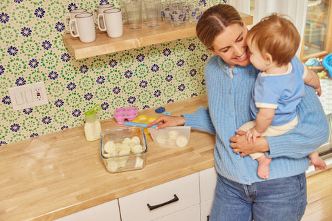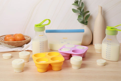 Freeze your milk in portions that work best for you and babe. Once frozen, store your cubes in a glass container and mark with the month.